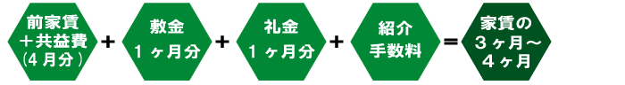 たいていの場合、家賃のおよそ3ヶ月分かかります。物件カードで確認してください。(契約後1週間以内にお振込み)